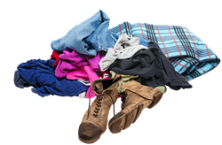 No clothes, shoes, blankets. These items get tangled in the recycling processing equipment. Donate, or dispose of these in your Garbage cart.