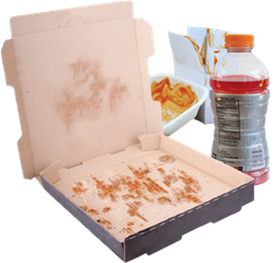 No food waste, liquids, food-soiled items. Food and liquids contaminate other recyclable items so they are no longer recyclable and go to the landfill. Empty liquids and scrape or shake out food residue from your recyclables before placing in your Recycling cart.