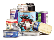 Empty and dry soup and vegetable cans, dog and cat food cans, and soda cans. Labels and lids are ok.