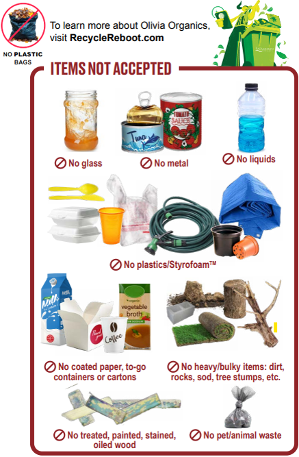 Items not accepted in the Organics cart include: plastic (bags, Styrofoam, take-out containers, utensils), coated paper, compostable cups/utensils, glass, metal, liquids, oil/grease and pet waste. Learn more on "What Not To Put In Your Organics Cart" section.